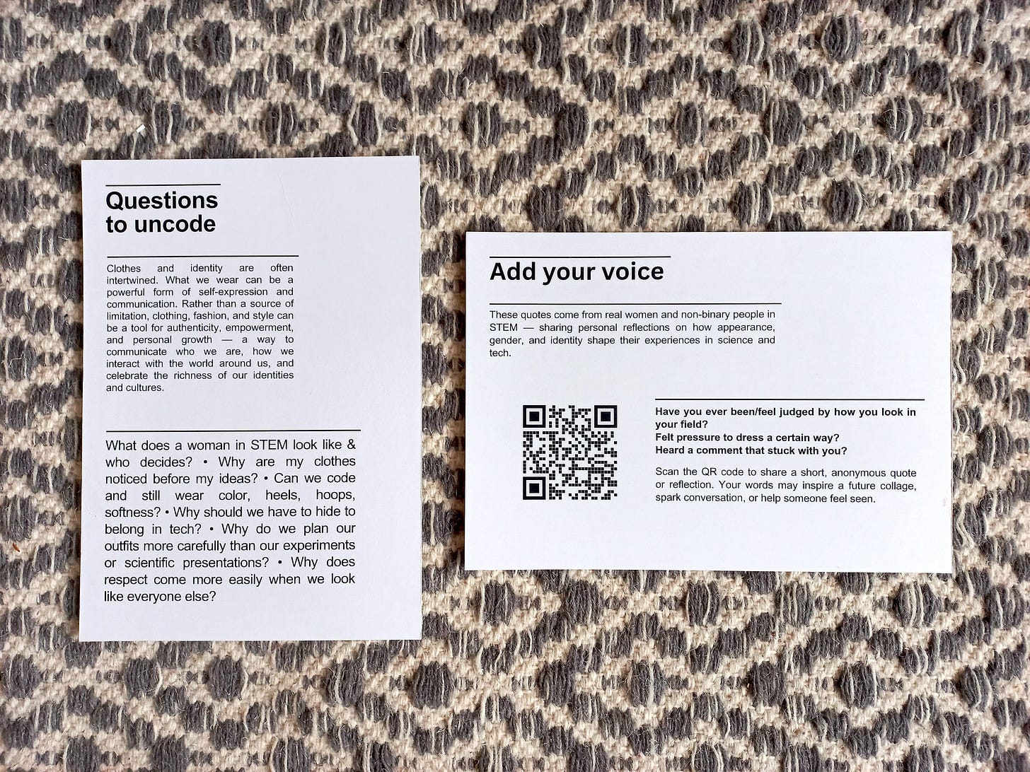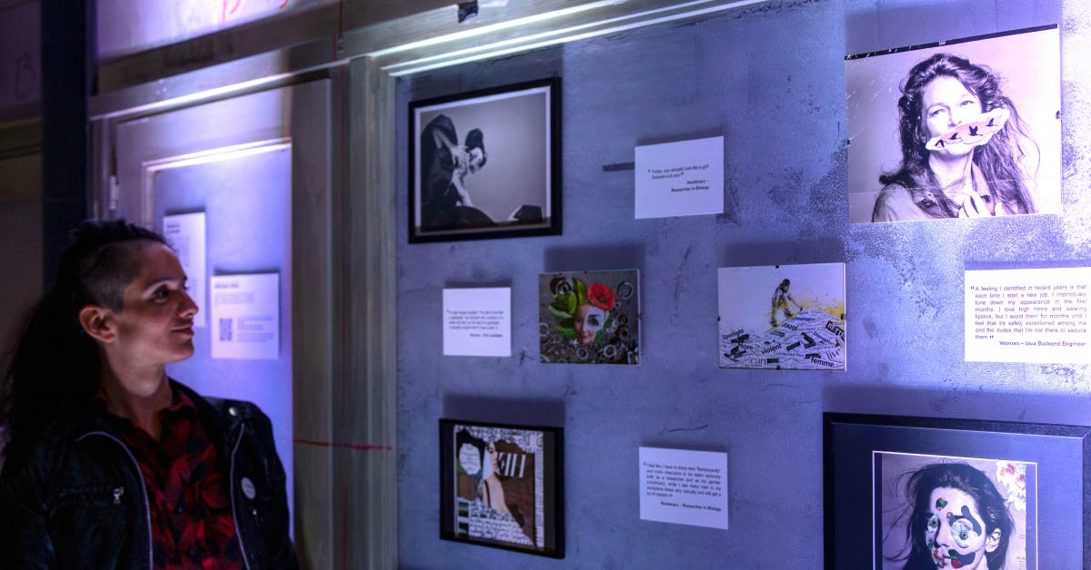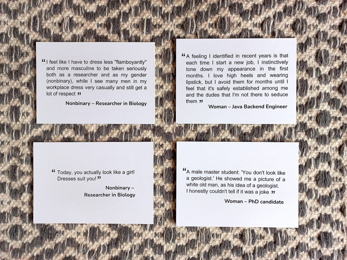 But I didn’t want the project to be just about my perspective. I wanted to explore how appearance and gender expression intersect with how competence, credibility, and belonging are perceived in STEM. To do that, I invited women and non-binary people in STEM to share their reflections anonymously through a short form. First, I circulated the form with the Pink Programming community, the organization for women and non-binary people in tech, where I volunteer. I also shared the form with colleagues working in life sciences.